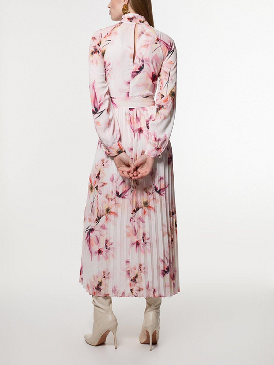 Tie Neck Woven Belted Floral Print Maxi Dress