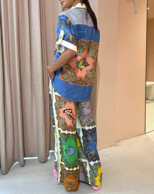 Sicily Blue Ethnic Pattern Trousers And Blouse Two Piece Suit