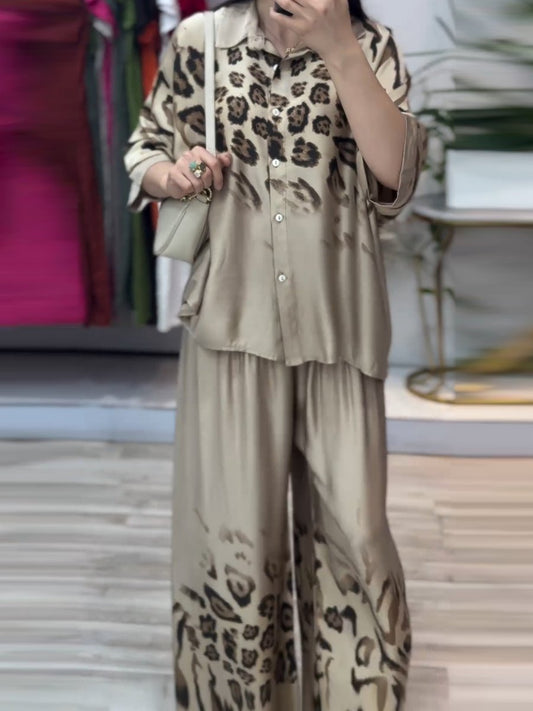 Loose Long-Sleeved Leopard Print Two-Piece Suit