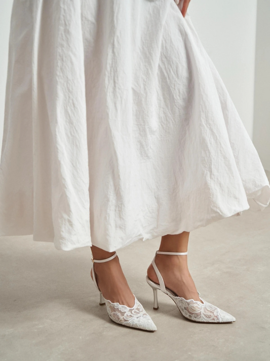 White Lace-Embroidered And Decorative Back Strap, 7–8 Cm Heel, Lace-Up Heels, Women's Shoes