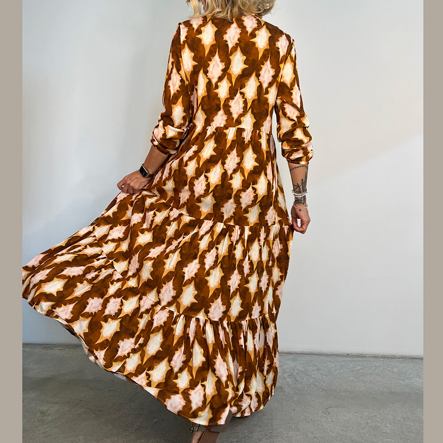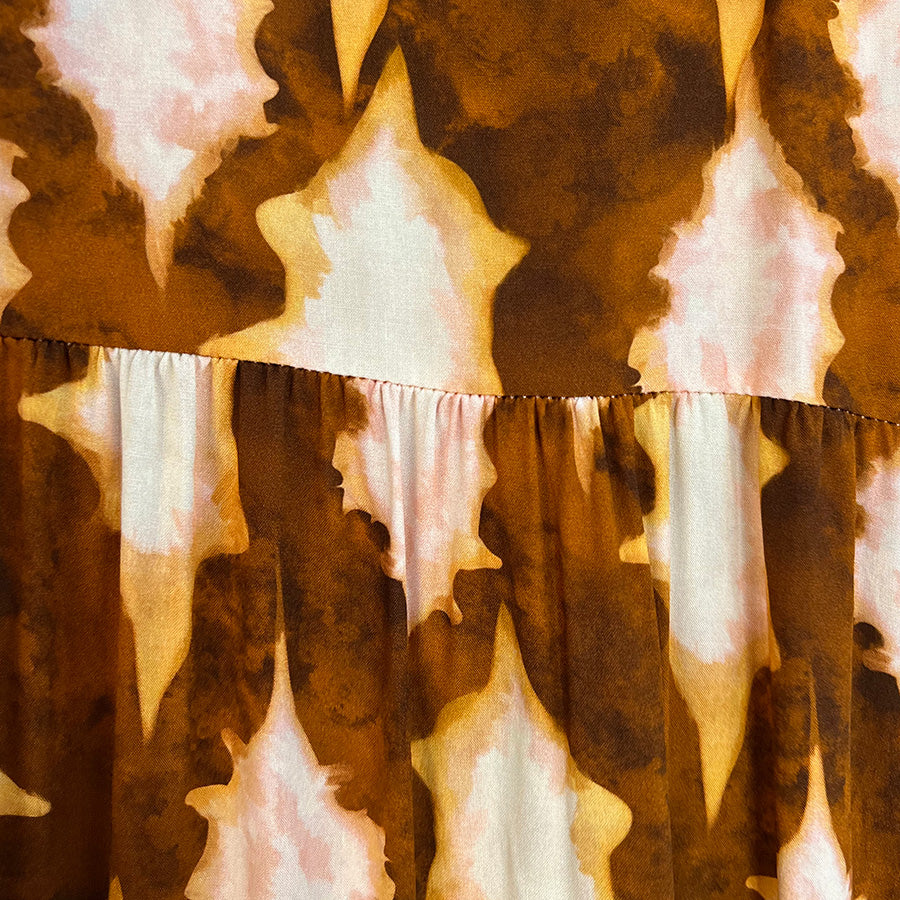 Block-printed by hand in our fresh Cobalt Lily butas, the Panama dress is a chic and timeless style, finished with a statement border placket and pretty, ricrac trim. With a gently fitted waist and tiered skirt, the Panama features flared sleeves, a ruffled neckline and a matching belt which can be added to accentuate your figure. Wear with trainers or dress up for an event. pair Organic cotton. Fully lined. Midi length.