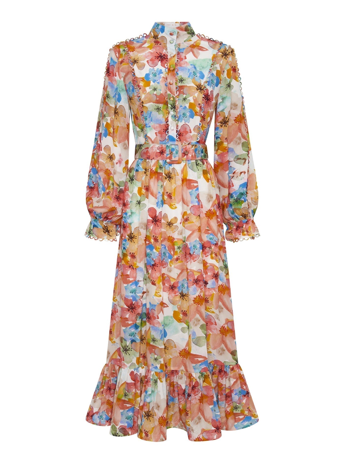 - Center front buttons open and close the garment on the bodice and a side zipper secures the dress.