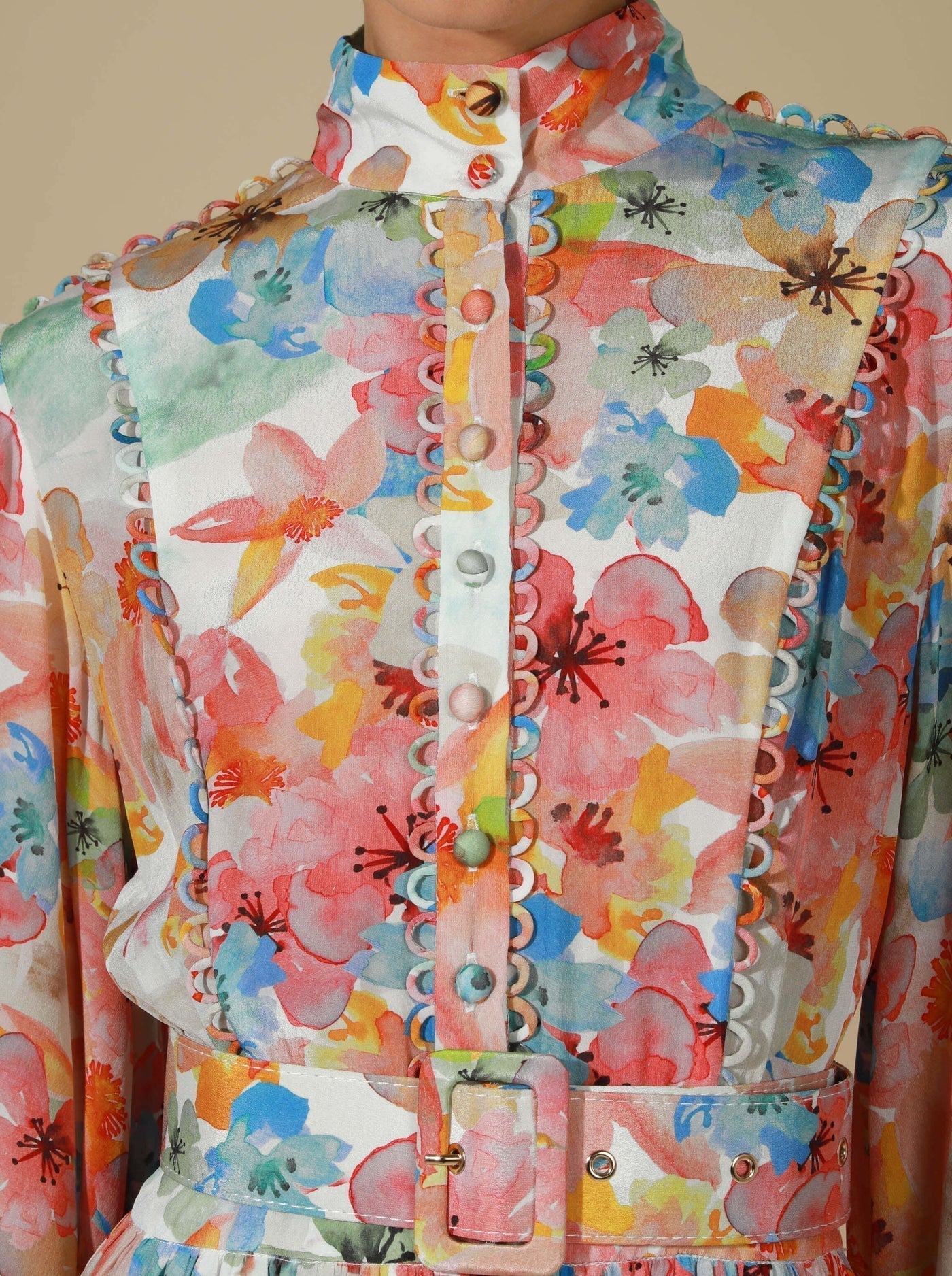 - Full-length Blouson Sleeves with loop rouleau details on the cuffs and down the sides of the sleeves for a 3D effect.