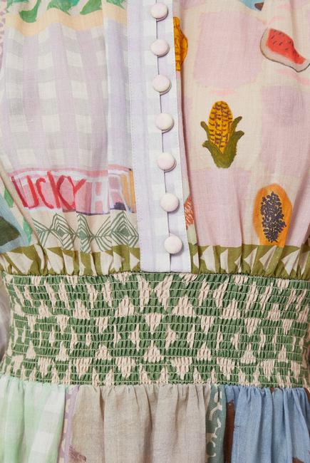 It features Shirred waist shirt dress silhouette, neck stand with pin tucks, blouson sleeves, shirred waistband, flounce hem and button fastenings through front.