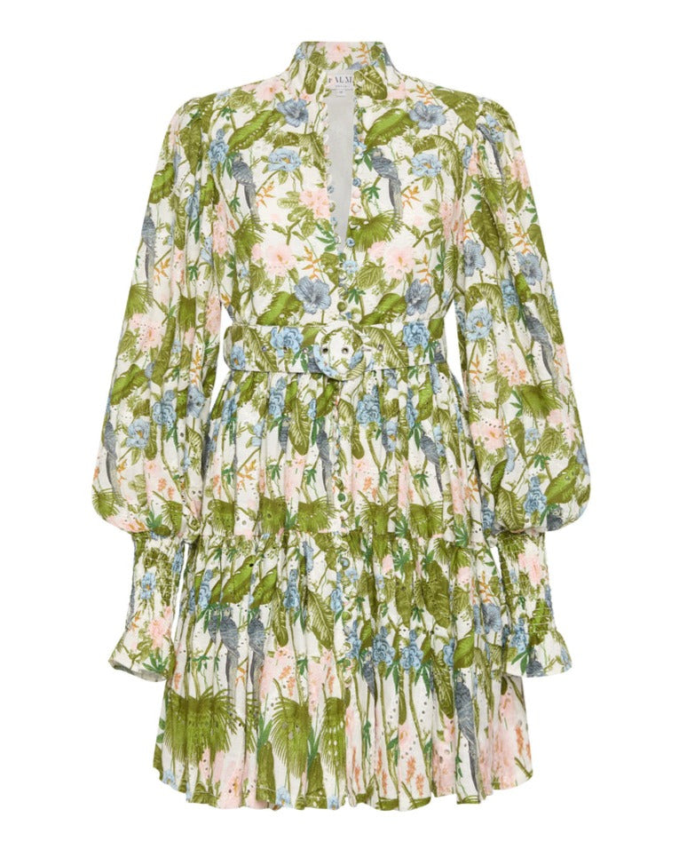 Crafted from 100% Linen Scallop in our exclusive Jungle Pink print, this statement mini features functional buttons from top to bottom for a varied look, billowing blouson sleeves with an elasticated cuff and a matching eyelet belt. Pair with your favourite heels for your next event show stopper.