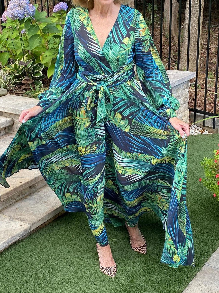 Lantern Sleeve V Neck Lace Up Leaf Printed Dress