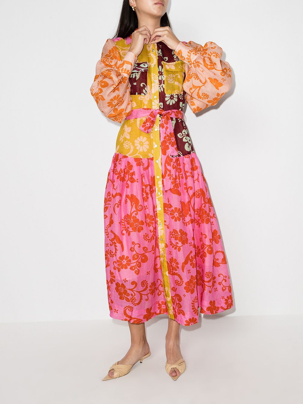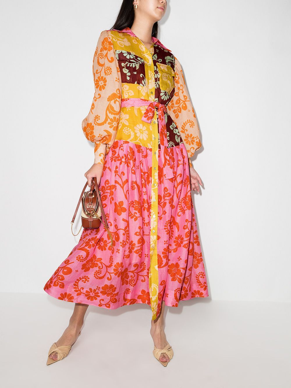 Luis patchwork midi shirtdress from featuring multicolour, cotton, ramie, all-over floral print, spread collar, front button fastening, belted waist, bishop sleeves, flared skirt and midi-length.