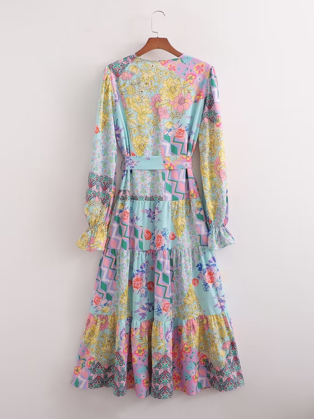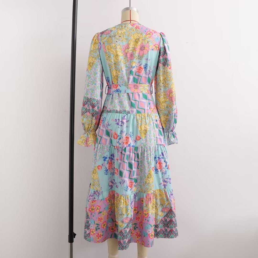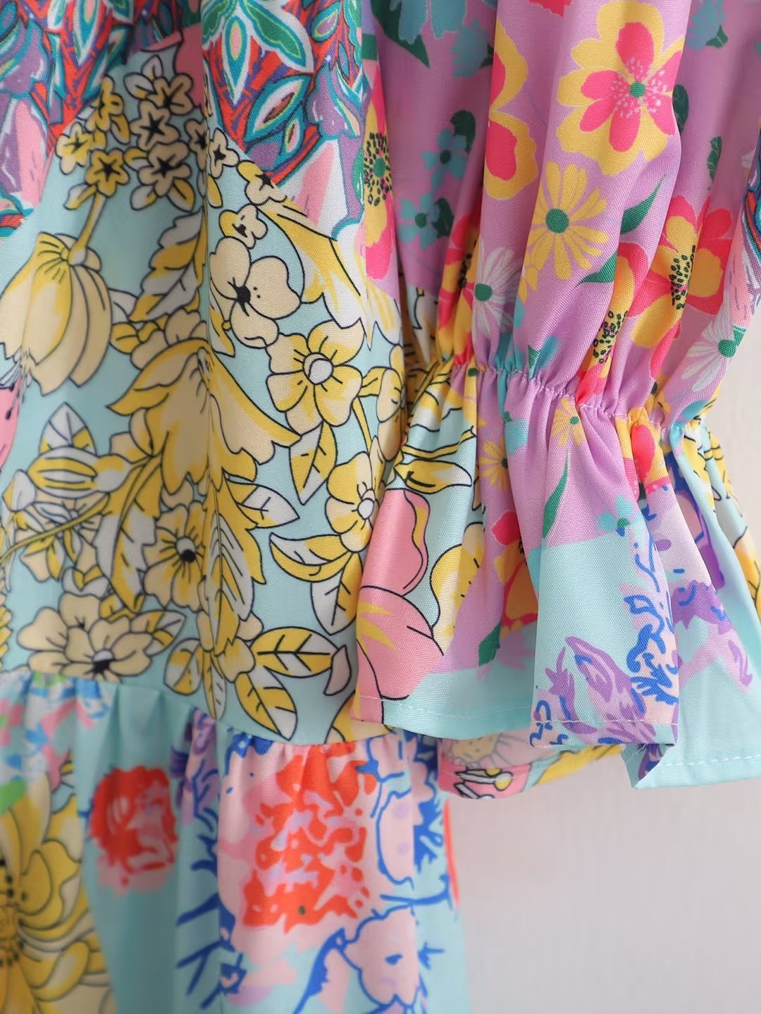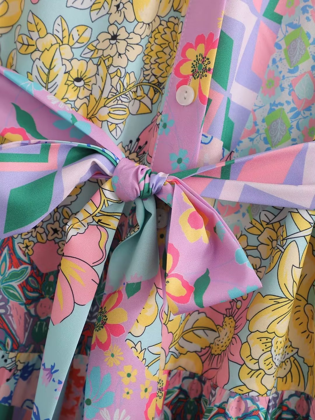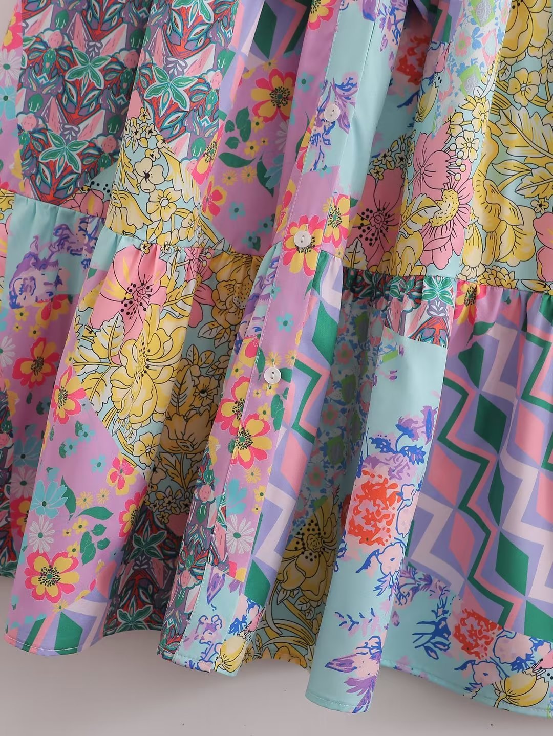 This patchwork floral dress is too cute! A tiered silhouette met with functional buttons down the front and a detachable tie belt at the waist. An elastic band at the wrists create a cute flared ruffle trim.