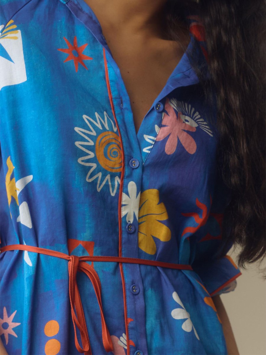 Printed Button Up Long Sleeve Tie Waist Maxi Dress