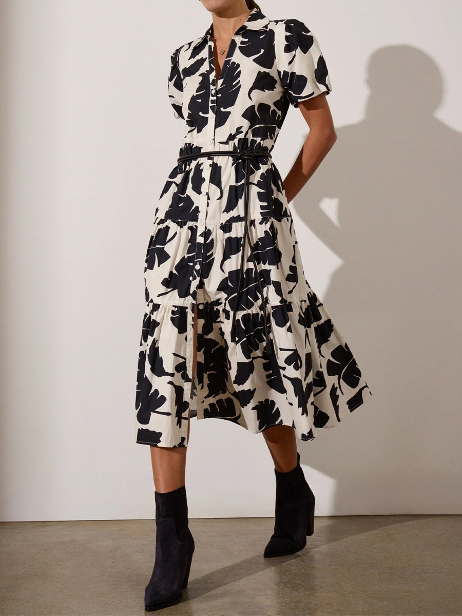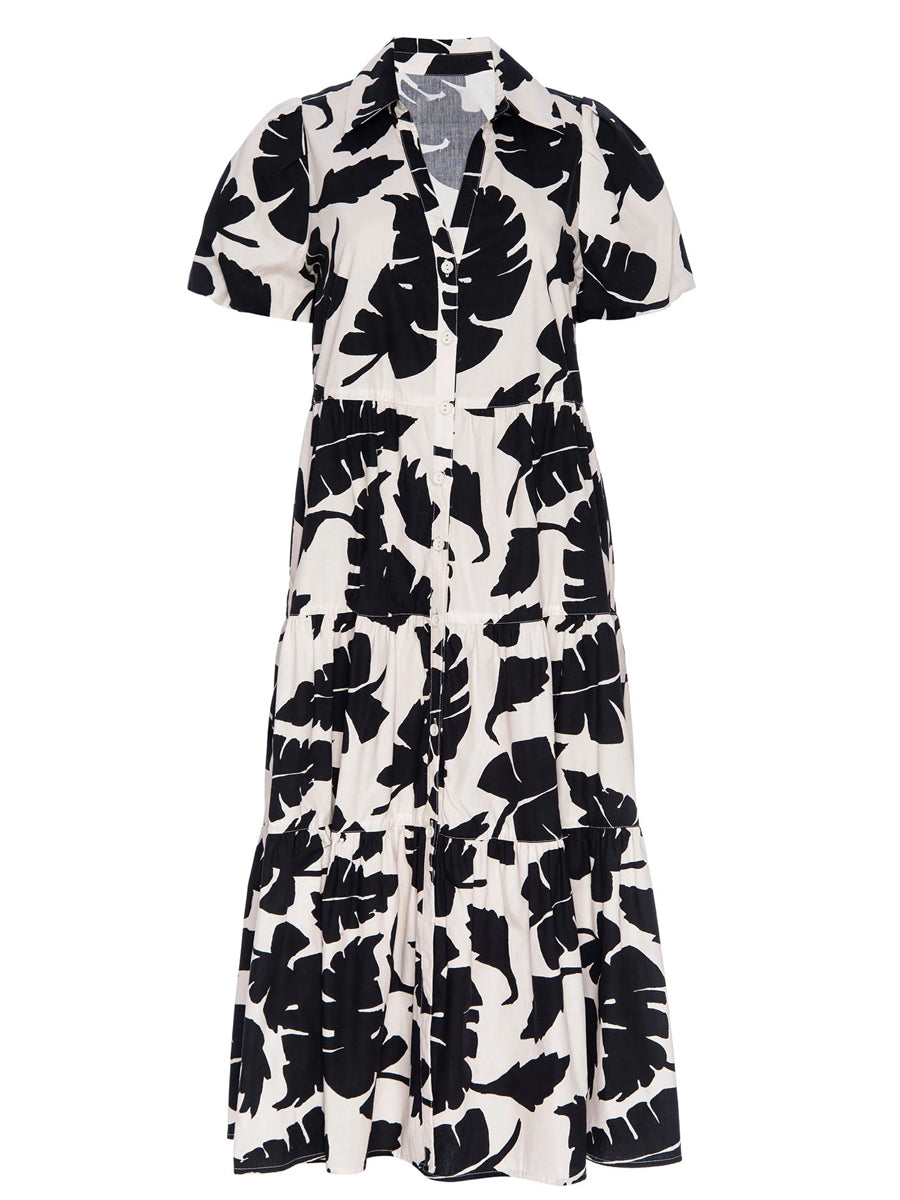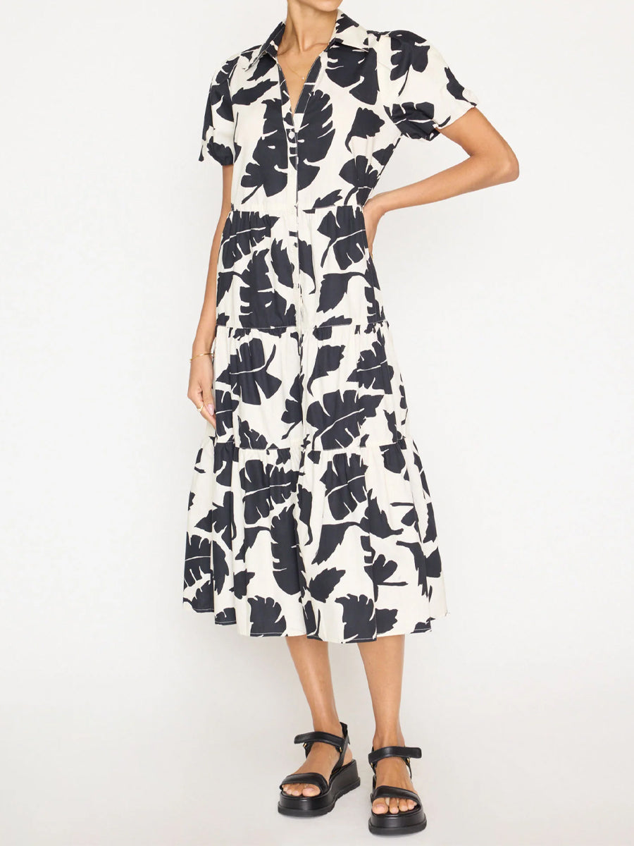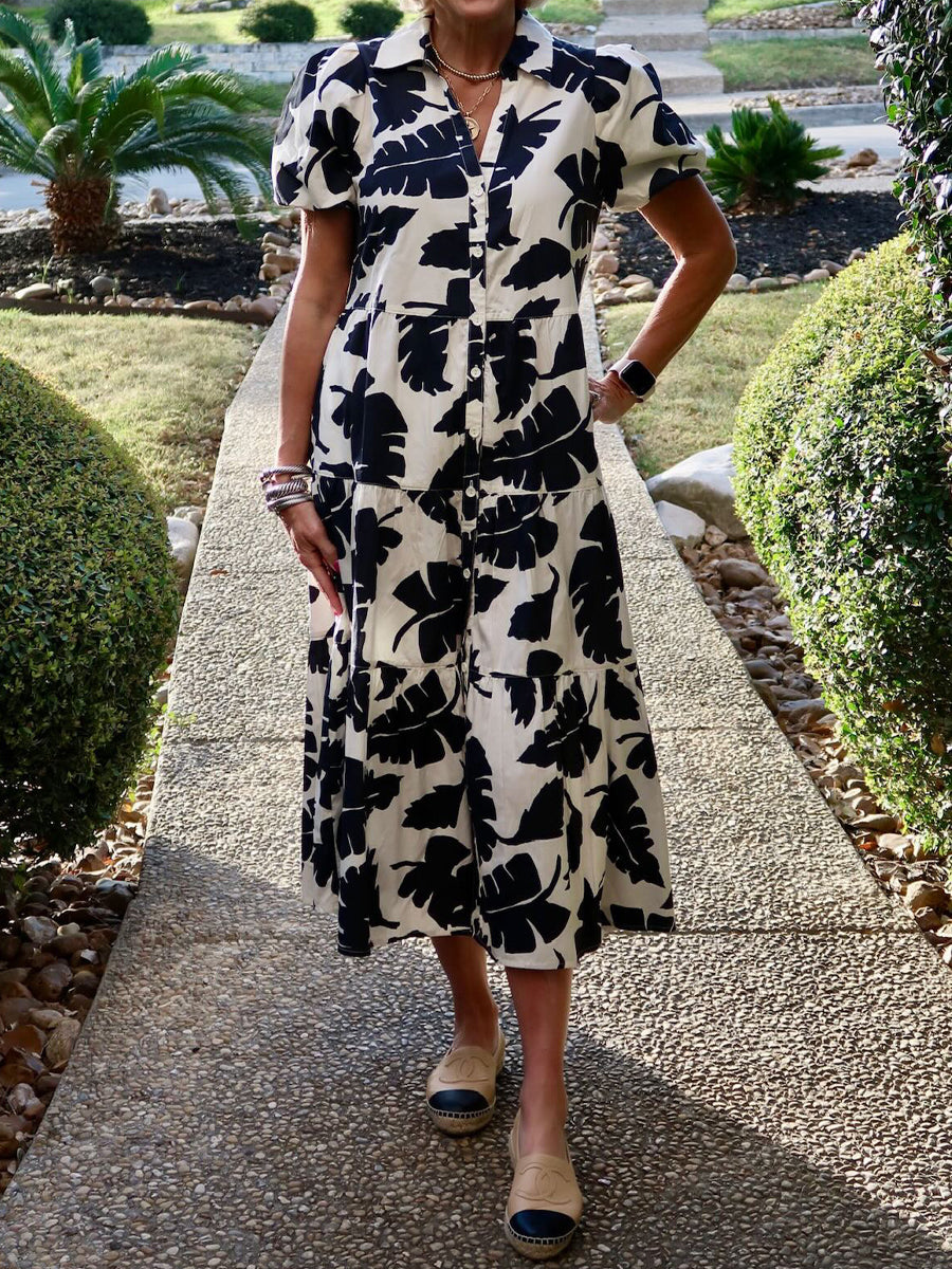This Printed Puff Sleeve Midi Dress features a unique leaf print and stylish button detailing, along with soft cotton fabric for comfort and a fashionable fit. Perfect for any occasion, this dress is versatile and suitable for all ages.