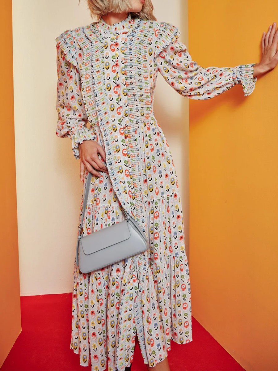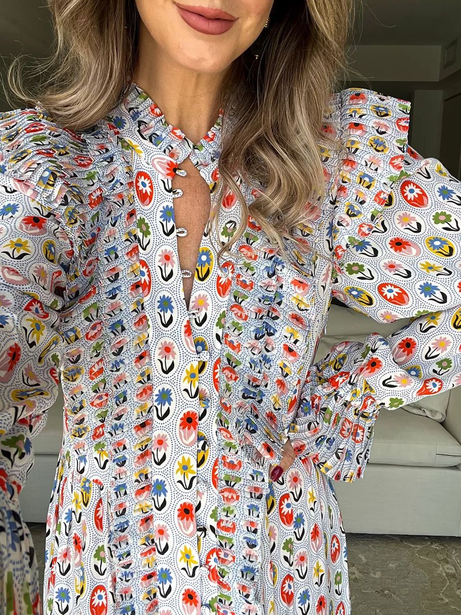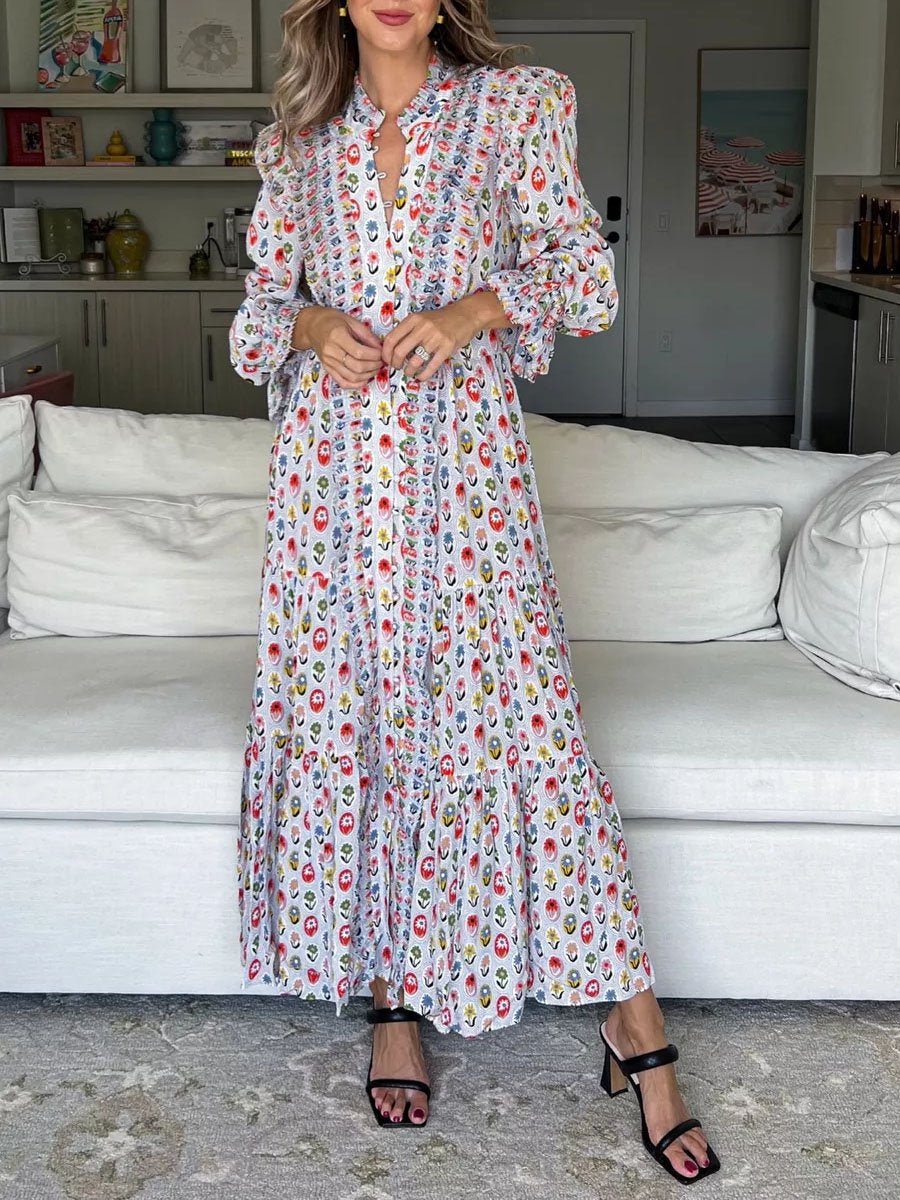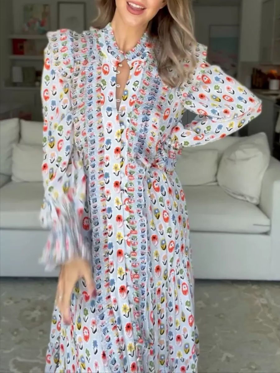 Printed Ruffe Button Up Long Sleeve Dress