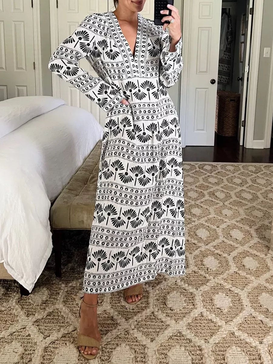 V Neck Long Sleeve Printed Dress