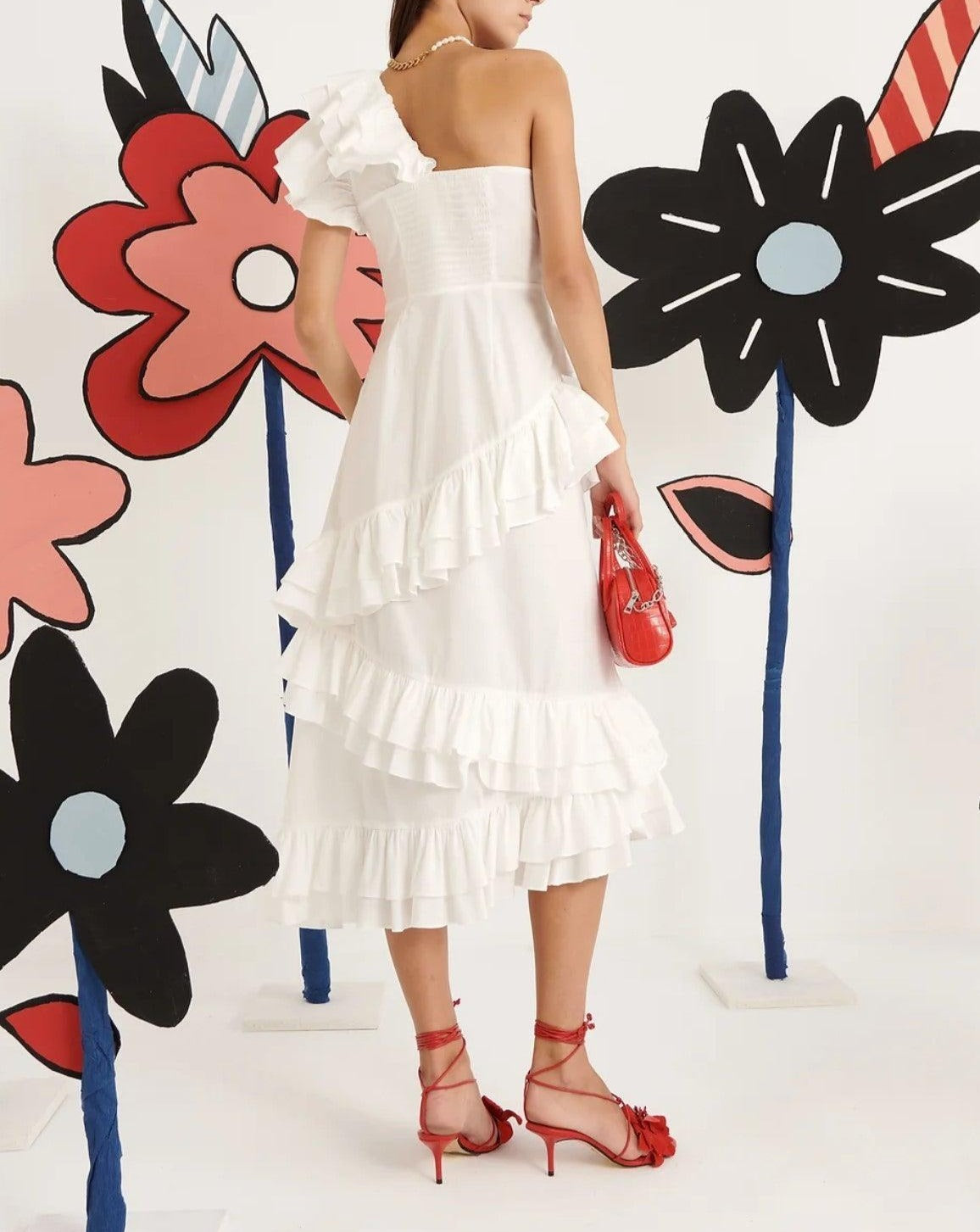 One Shoulder NecklineTiered Ruffle SleeveAsymmetrical Cascading RufflesLightweight FabricationRuffle Hem